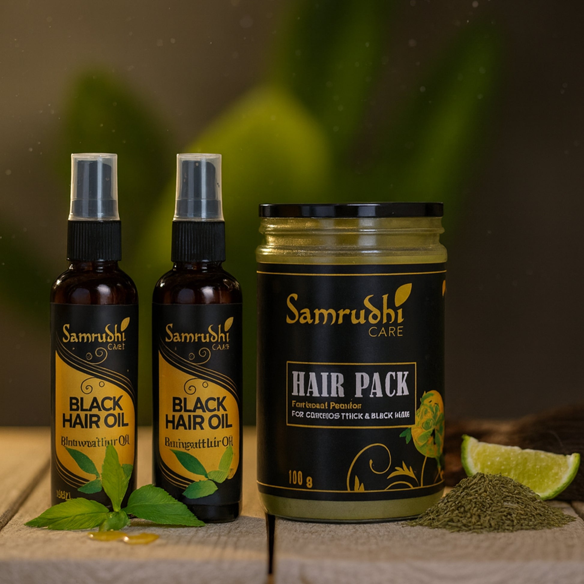 Black Oil: Nili swarasa, Bringa raj Swarasa, Bunimba, Haldi, Yashti, Bhumitala, Amlakai, Thanikai, and Coconut Oil .